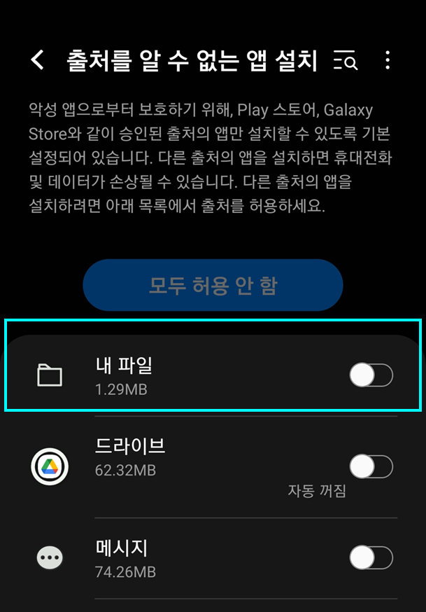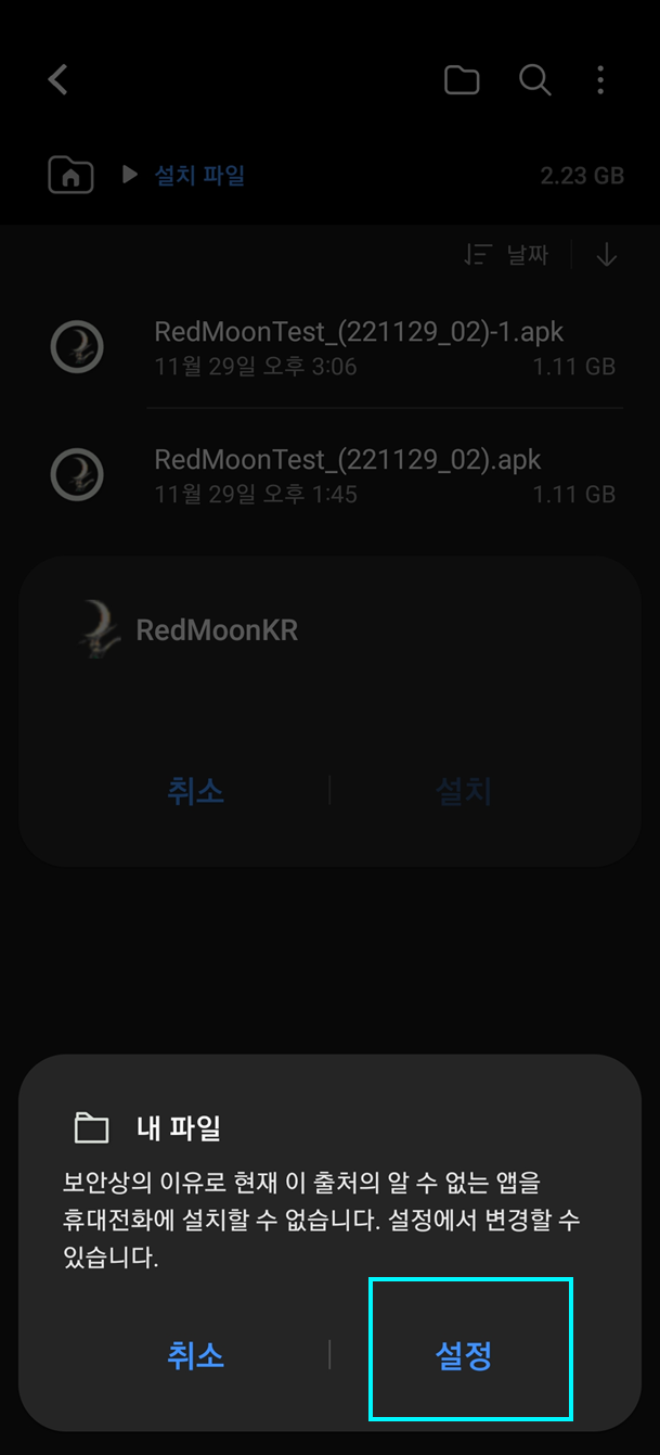 3. 다운로드가 정상적으로 진행되지 않으며, 위와 같은 메세지가 뜨는 경우에는 아래와 같이 설정 창에서 출처를 알 수 없는 앱 설치를 허용해야 다운로드 가능하십니다.