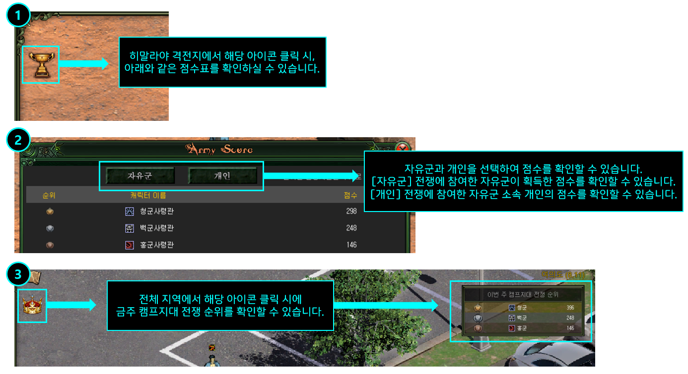 - 히말라야 격전지를 제외한 다른 지역에서도 금주 자유군 및 개인 점수표를 확인할 수 있습니다.