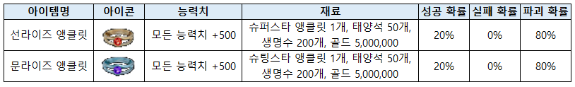 - 선라이즈 앵클릿, 문라이즈 앵클릿은 500Lv 이상부터 착용 가능한 아이템 입니다.