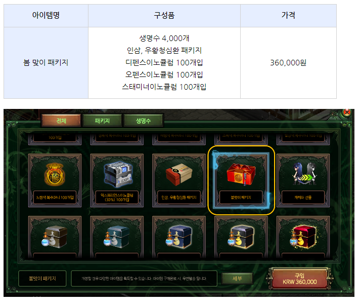 - 캐쉬샵에 아래 봄 맞이 패키지 아이템 판매가 추가되었습니다.
